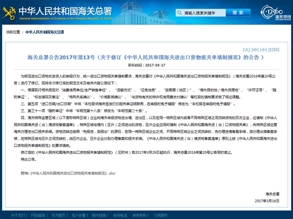 修订后的《中华人民共和国海关进出口货物报关单填制规范》(见附件)自2017年3月29日起执行,海关总署2016年第20号公告同时废止。